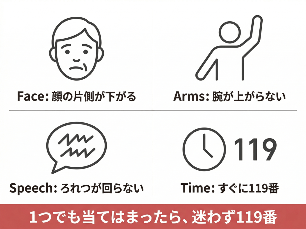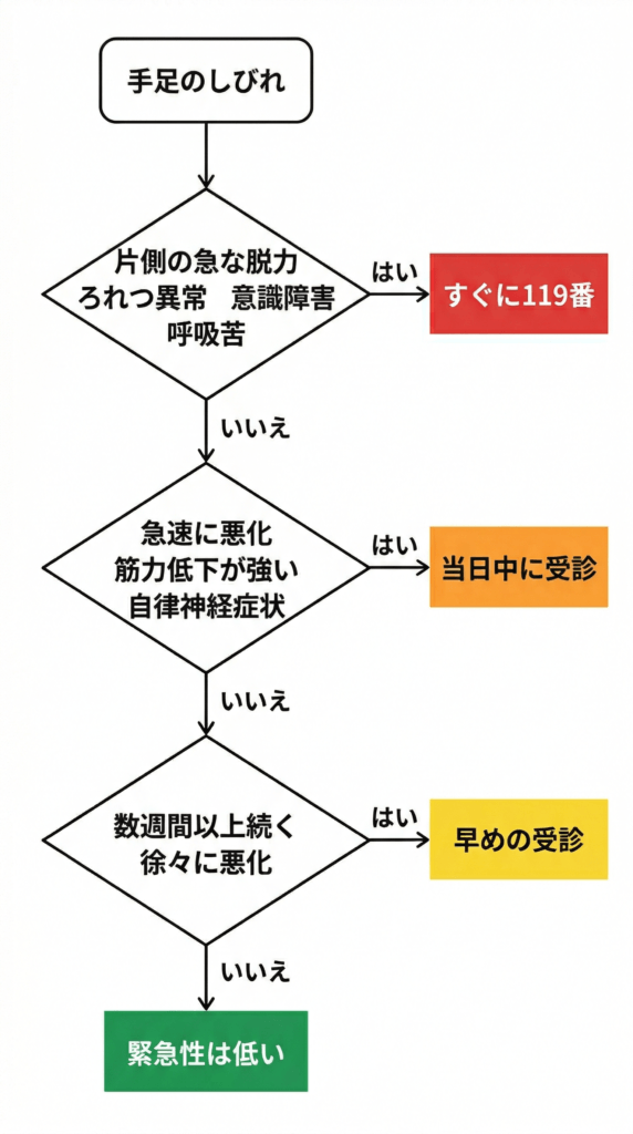 手足のしびれは多くの場合、すぐに命に関わるものではありません。ただし、F.A.S.T. ――顔・腕・言語・時間の確認――と呼ばれる症状が出た場合は脳卒中の可能性があるため、ためらわずに119番への連絡を検討してください。[1]