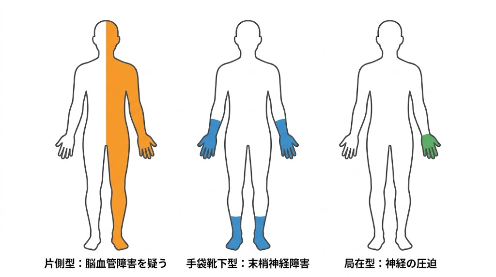 しびれの「どこに出るか」と「どのように広がるか」が、原因を絞り込む大きな手がかりになります。[2][4]